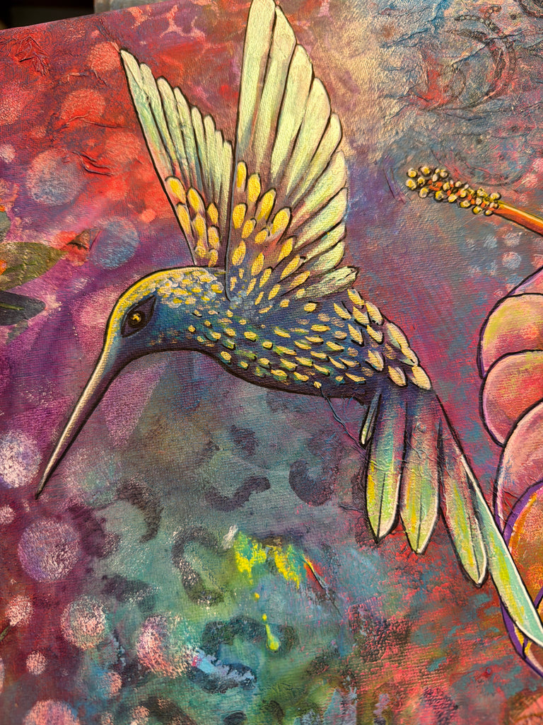 This is one of my repurposed/recycled demo canvas’s from my art retreats and workshops, that I have added to & embellished using Mixed media - ink, acrylic,, markers, collage & stencil.